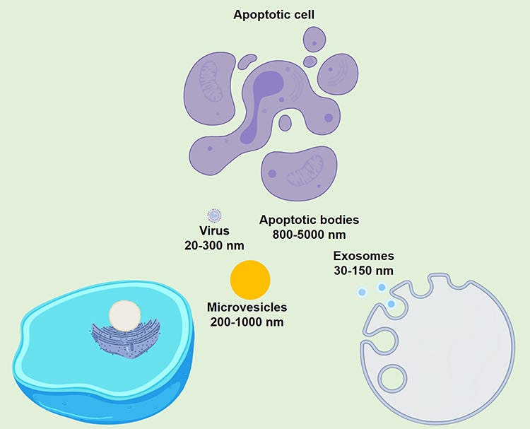 In the fascinating world of how cells talk to each other, there is something really special called EVs, or Extracellular Vesicles. Imagine these as tiny bubbles that come from cells. These tiny bubbles are not all the same; they can be very different from each other. Some are called microvesicles, some are known as exosomes, and others are named apoptotic bodies. Each of these kinds has its own unique features, like how they're made and what they do. Scientists find these differences really interesting.
