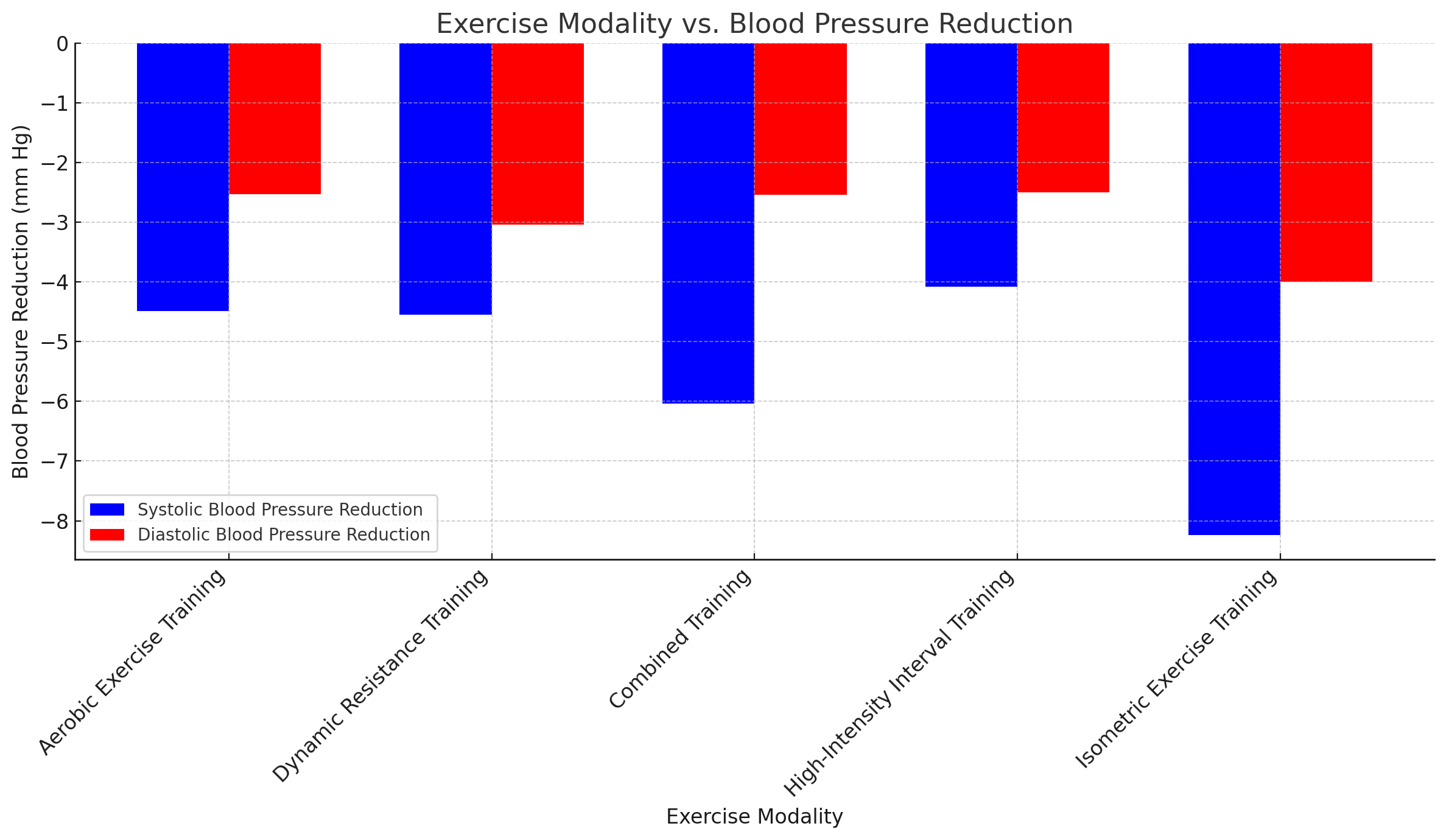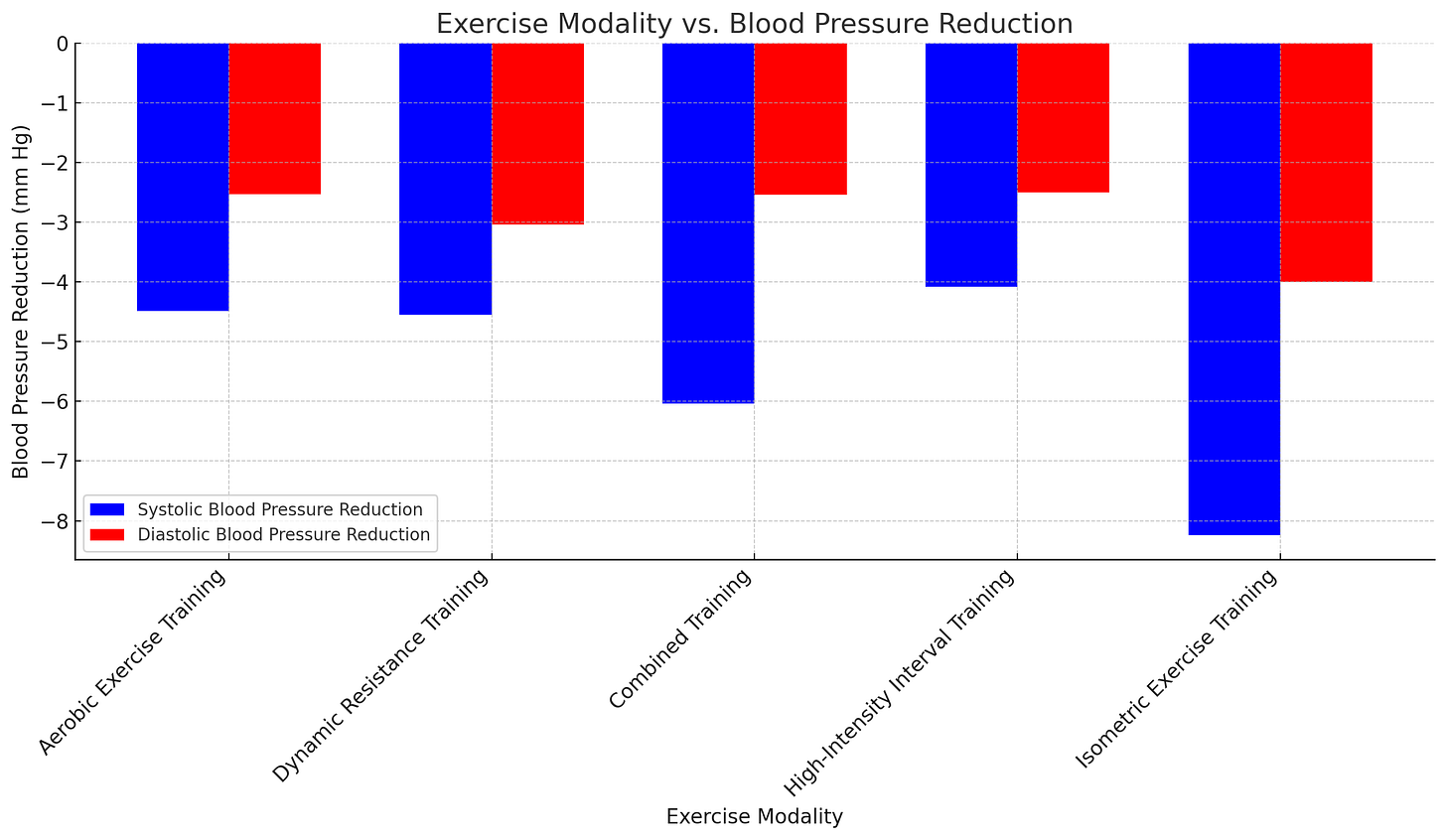 High-Intensity Interval: Reduced systolic by 4.08 mm Hg and diastolic by 2.50 mm Hg.