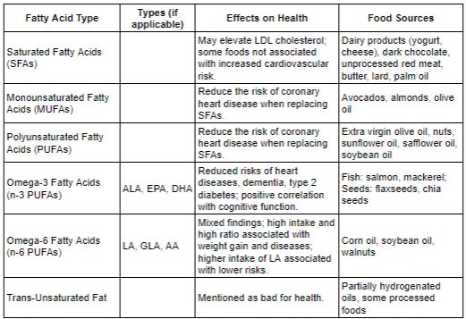 Saturated Fats (0 double bonds): Often linked to bad cholesterol and heart diseases.
